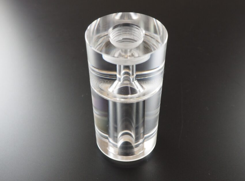 無垢から削り出したアクリル可視化部品。「旋盤+フライス」の合わせ技に「治具づくり」のノウハウが詰まった加工品です。