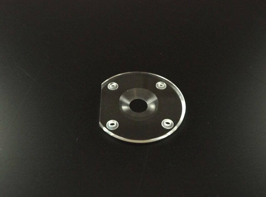 板の間に穴が通る複雑な形状です。透明度を損なわずに加工しています。
