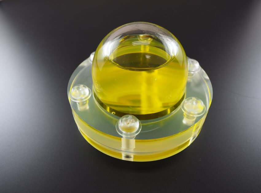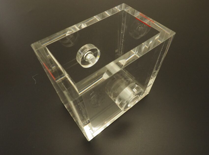 アクリル加工事例|液体の流れを可視化するスノードーム型サンプル