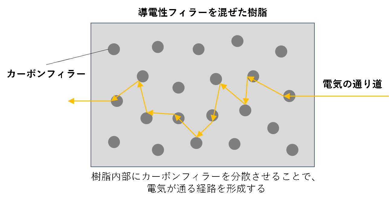 一方で、導電性樹脂はカーボンなどの導電性フィラー(補強材)を樹脂に混合し、内部に電気の通り道を作ることで導電性を発揮します。