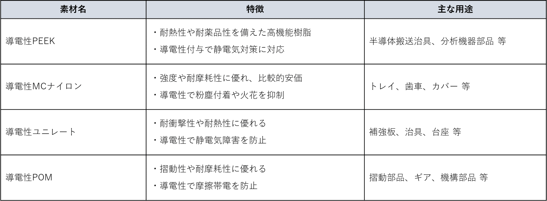 ここでは、切削加工に対応できる代表的な導電性樹脂と、その特徴を紹介します。