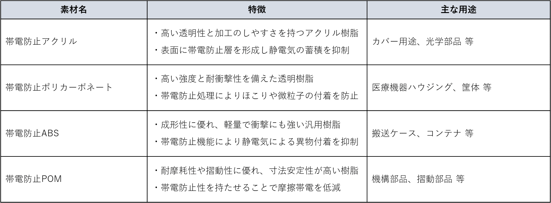 透明性を活かしたカバー用途や、搬送ケース、電子機器外装などで利用されます。