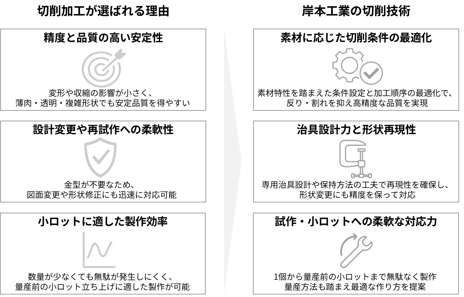 こうした開発現場の要求に応えるため、岸本工業では次の3つの観点を重視して加工体制を整えています。