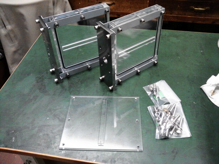 提示された図面をもとに、組付け精度や耐久性を確保する観点から一部仕様の見直しを提案し、アクリルと金属部品を組み合わせた構造で製作を進めました。